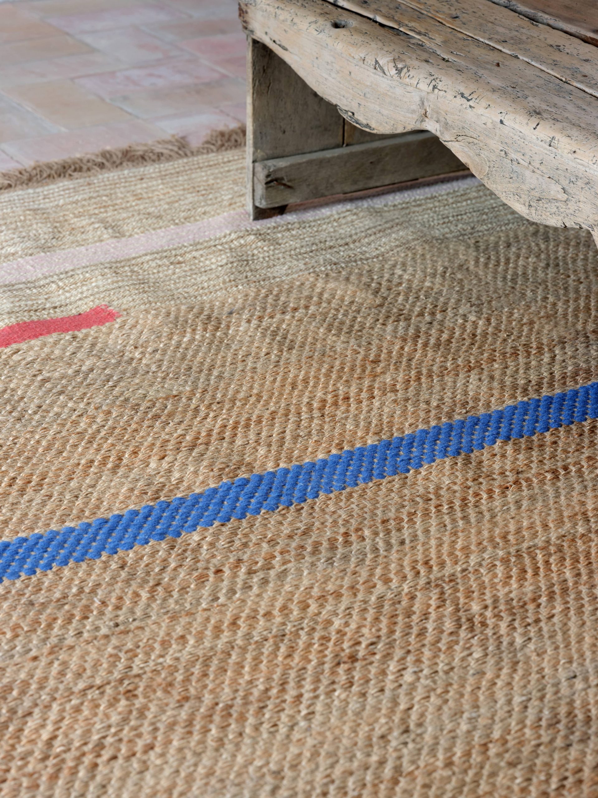 The Diego rug is a rug with colorful lines, which remind Rohner of Mexico due to its combinations of pink, red, and blue.